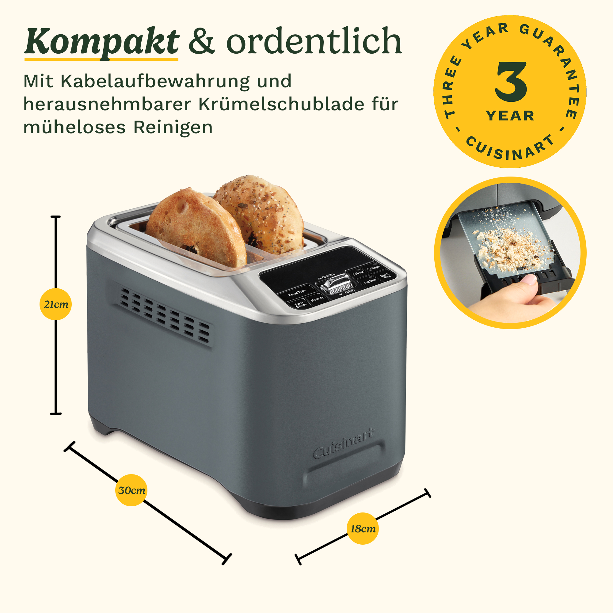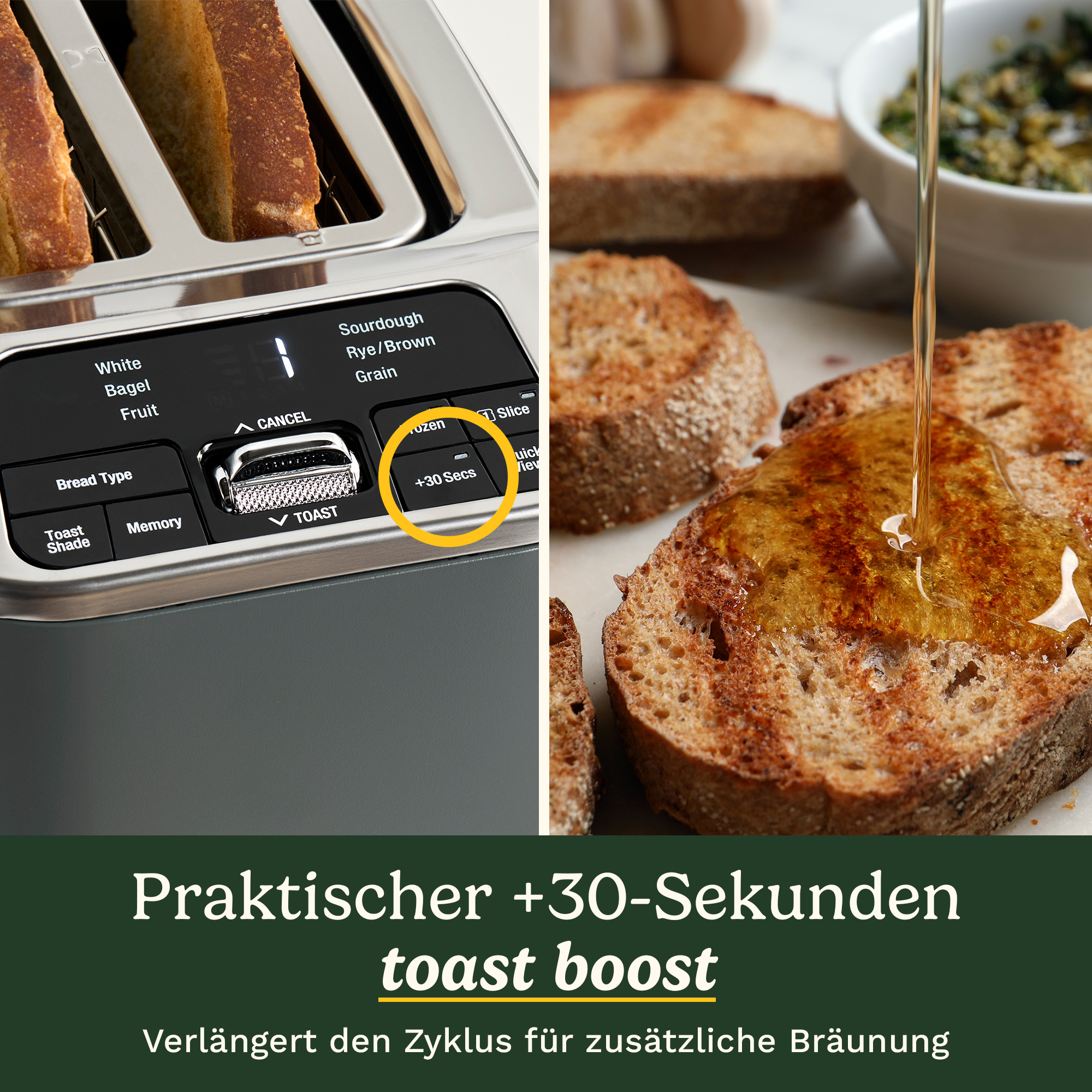 - High-Lift QuickView™ + 30 Sekunden für präzise Kontrolle: Werfen Sie einen Blick auf Ihren Toast während des Zyklus, ohne den Vorgang zu unterbrechen, und fügen Sie 30 Sekunden hinzu für das perfekte goldene Finish – weil Sie manchmal einfach wissen, dass er ein bisschen mehr braucht.