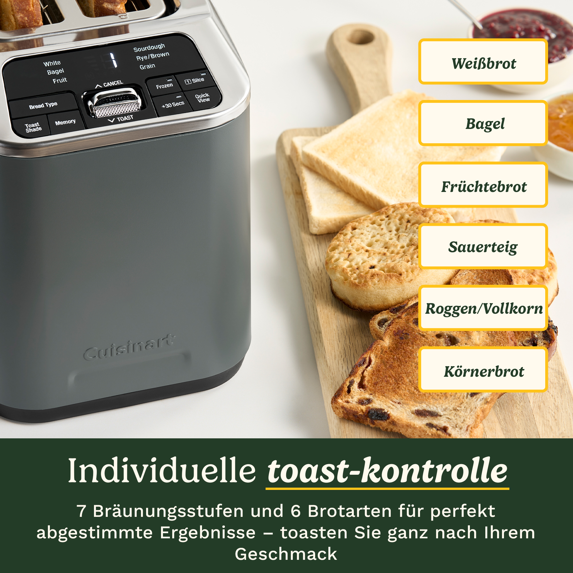 - Individuelles Toasten nach Ihren Wünschen: Wählen Sie aus 7 Bräunungsstufen – von leicht getoastet bis goldbraun – und 6 Brottypen, darunter Bagel, Sauerteig, Früchtebrot und Körnerbrot. Toasten oder auftauen Sie jede Sorte entsprechend ihrer Textur für perfekte Ergebnisse.