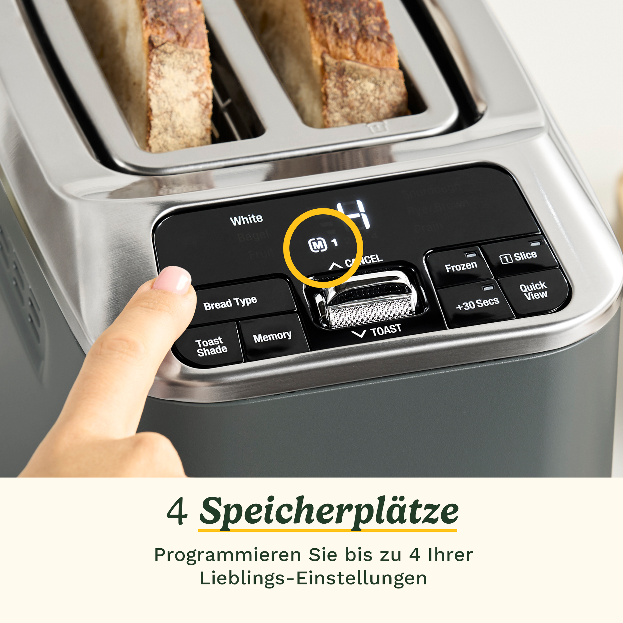 - Merkt sich mühelos Ihren perfekten Toast: Speichern Sie bis zu 4 personalisierte Einstellungen für Ihre Lieblingsbrote und Bräunungsgrade. Genießen Sie jedes Mal gleichbleibende Ergebnisse – genau nach Ihrem Geschmack.
